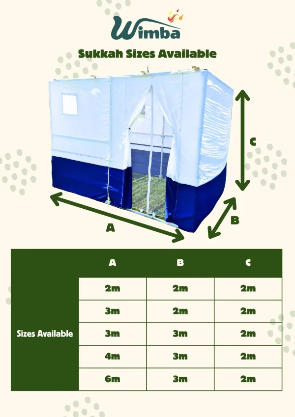 | Sukkah’s are intended for a specific event and are as such only meant for short term temporary assembly and disassembly. Wimba warranty applies only to the normal use of the product, normal wear and tear excepted, in accordance with written use instructions or manual. The warranty does not apply to damage caused by accident, abuse, weather conditions, misuse, modification or incorrect dismantle, erection, packing and storage of the product. |