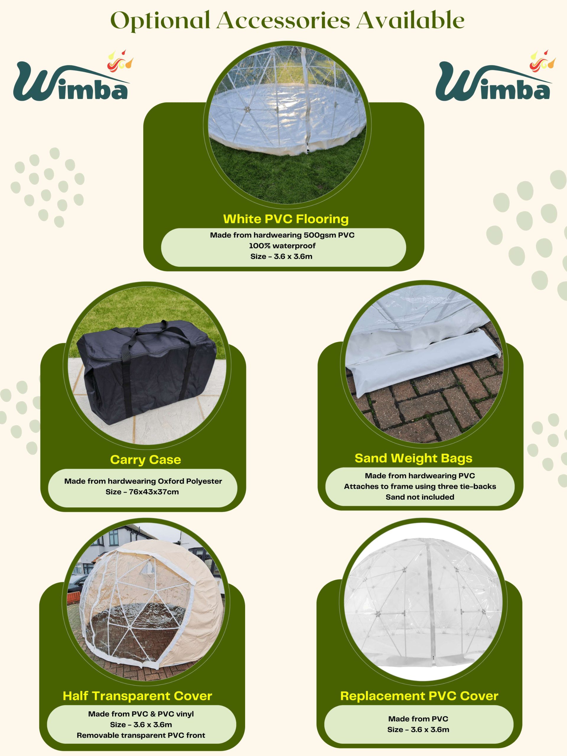 • Accessories also available – To help you make most use of your Geodesic Garden Igloo Dome Bubble Tent we also sell a wide range of accessories including flooring, carry cases, replacement covers etc.
