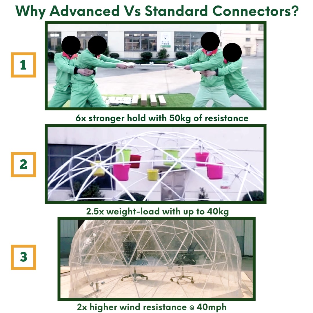 • Robust frame – All our Geodesic Garden Igloo Dome Bubble Tents come with advanced connectors on BOTH the upper and lower frame making the frame not only streamlined to build and dismantle, but also giving the frame a greater hold against weather elements.