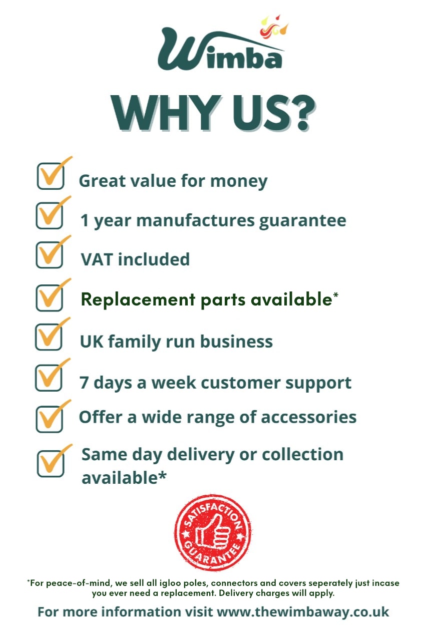 • Igloos are intended for events and other arrangements and are as such only meant for short term temporary assembly and disassembly. Wimba warranty applies only to the normal use of the product, normal wear and tear excepted, in accordance with written use instructions or manual. The warranty does not apply to damage caused by accident, abuse, weather conditions, misuse, modification or incorrect dismantle, erection, packing and storage of the product.