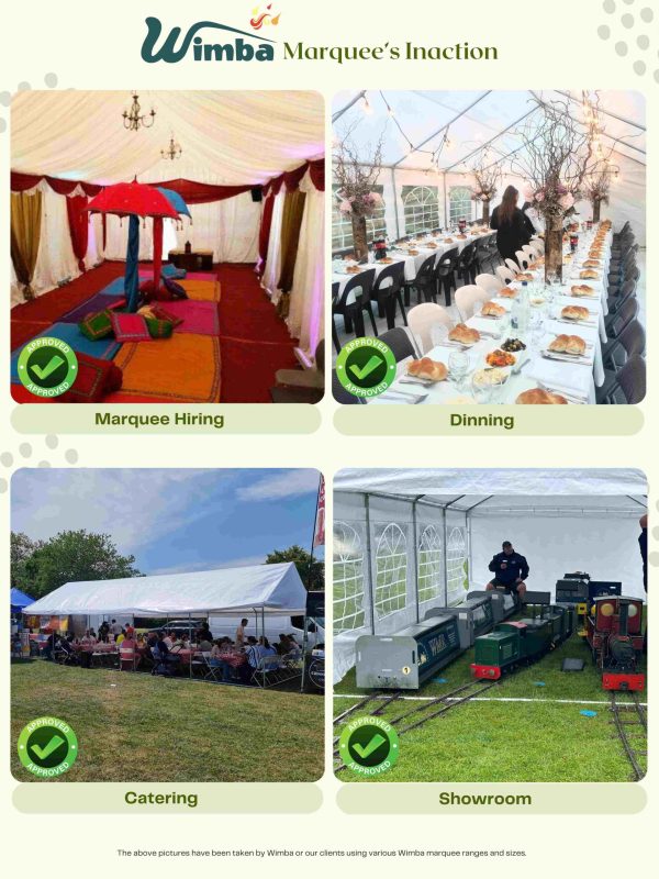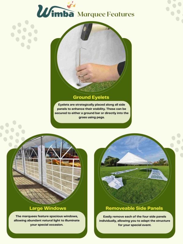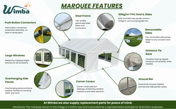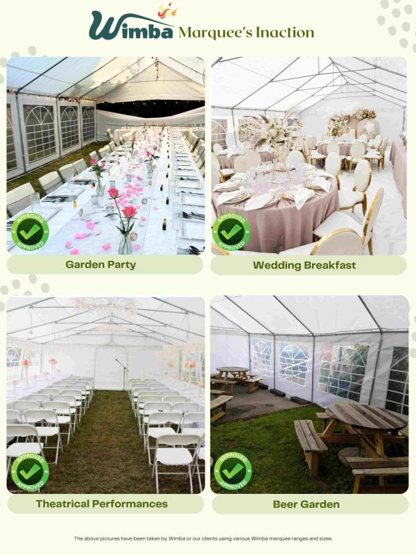 | Marquees are intended for events and other arrangements and are as such only meant for short term temporary assembly and disassembly. Wimba warranty applies only to the normal use of the product, normal wear and tear excepted, in accordance with written use instructions or manual. The warranty does not apply to damage caused by accident, abuse, weather conditions, misuse, modification or incorrect dismantle, erection, packing and storage of the product. | |