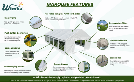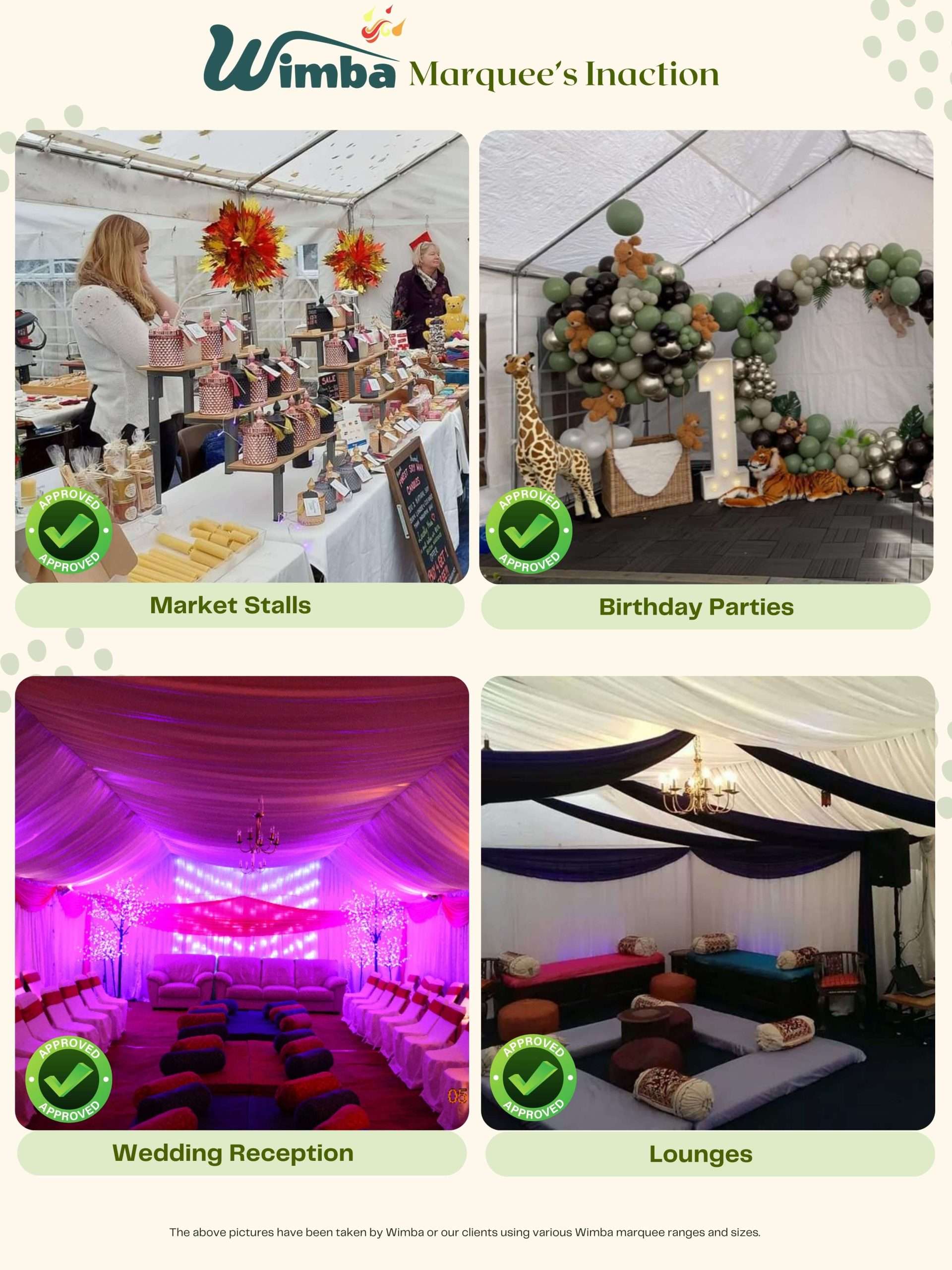 | Marquees are intended for events and other arrangements and are as such only meant for short term temporary assembly and disassembly. Wimba warranty applies only to the normal use of the product, normal wear and tear excepted, in accordance with written use instructions or manual. The warranty does not apply to damage caused by accident, abuse, weather conditions, misuse, modification or incorrect dismantle, erection, packing and storage of the product. |