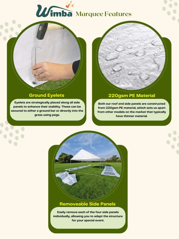 | Marquees are intended for events and other arrangements and are as such only meant for short term temporary assembly and disassembly. Wimba warranty applies only to the normal use of the product, normal wear and tear excepted, in accordance with written use instructions or manual. The warranty does not apply to damage caused by accident, abuse, weather conditions, misuse, modification or incorrect dismantle, erection, packing and storage of the product. | |