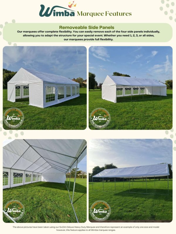 Our Deluxe Heavy-Duty Plus range is our grade 2 range. Like all our marquees, the frame is made of galvanized steel that is protected against corrosion. This range also comes complete with hard wearing 500gsm PVC tarpaulin for both the roof and side panels and a ground bar for extra stability.