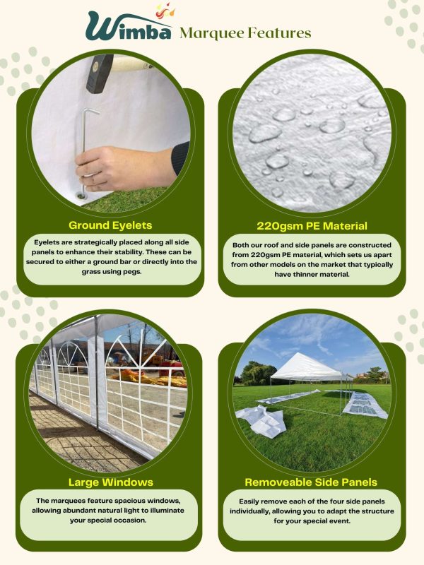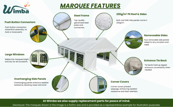 | Marquees are intended for events and other arrangements and are as such only meant for short term temporary assembly and disassembly. Wimba warranty applies only to the normal use of the product, normal wear and tear excepted, in accordance with written use instructions or manual. The warranty does not apply to damage caused by accident, abuse, weather conditions, misuse, modification or incorrect dismantle, erection, packing and storage of the product. | |