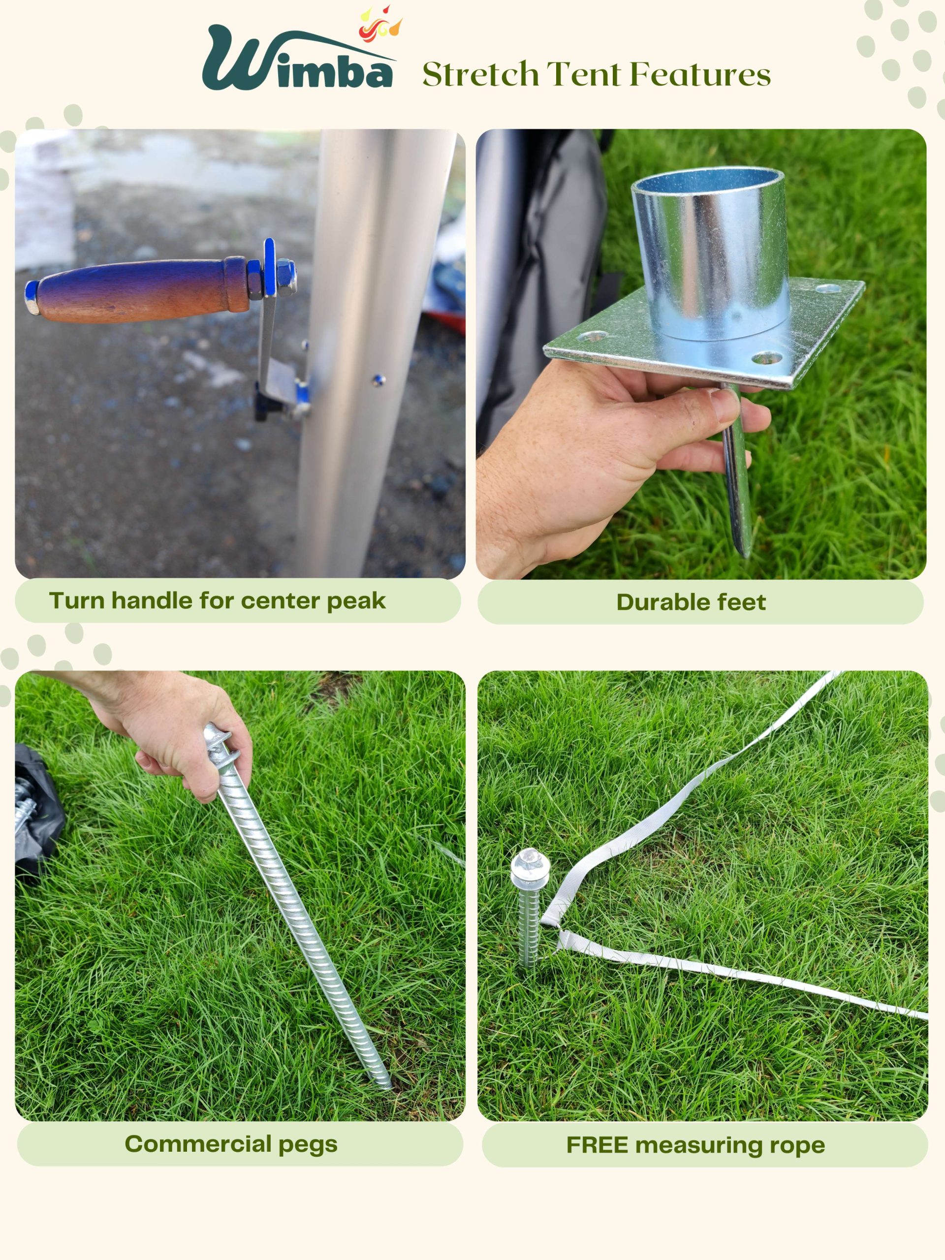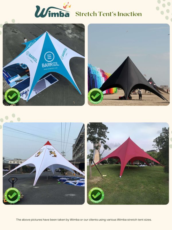 | Stretch Tents are intended for events and other arrangements and are as such only meant for short term temporary assembly and disassembly. Wimba warranty applies only to the normal use of the product, normal wear and tear excepted, in accordance with written use instructions or manual. The warranty does not apply to damage caused by accident, abuse, weather conditions, misuse, modification or incorrect dismantle, erection, packing and storage of the product. |