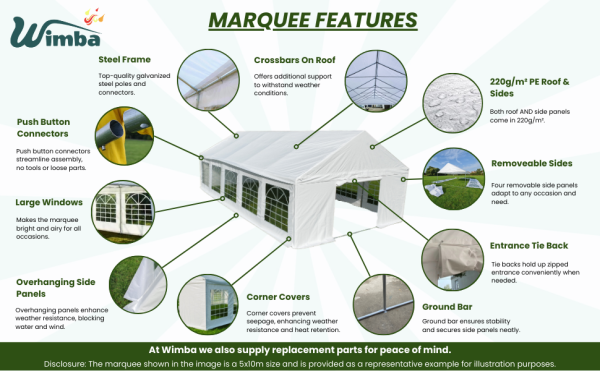 | Marquees are intended for events and other arrangements and are as such only meant for short term temporary assembly and disassembly. Wimba warranty applies only to the normal use of the product, normal wear and tear excepted, in accordance with written use instructions or manual. The warranty does not apply to damage caused by accident, abuse, weather conditions, misuse, modification or incorrect dismantle, erection, packing and storage of the product. | |