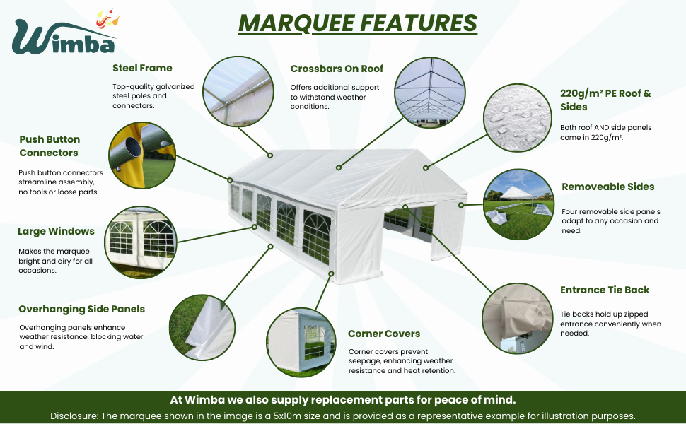 | Marquees are intended for events and other arrangements and are as such only meant for short term temporary assembly and disassembly. Wimba warranty applies only to the normal use of the product, normal wear and tear excepted, in accordance with written use instructions or manual. The warranty does not apply to damage caused by accident, abuse, weather conditions, misuse, modification or incorrect dismantle, erection, packing and storage of the product. | |