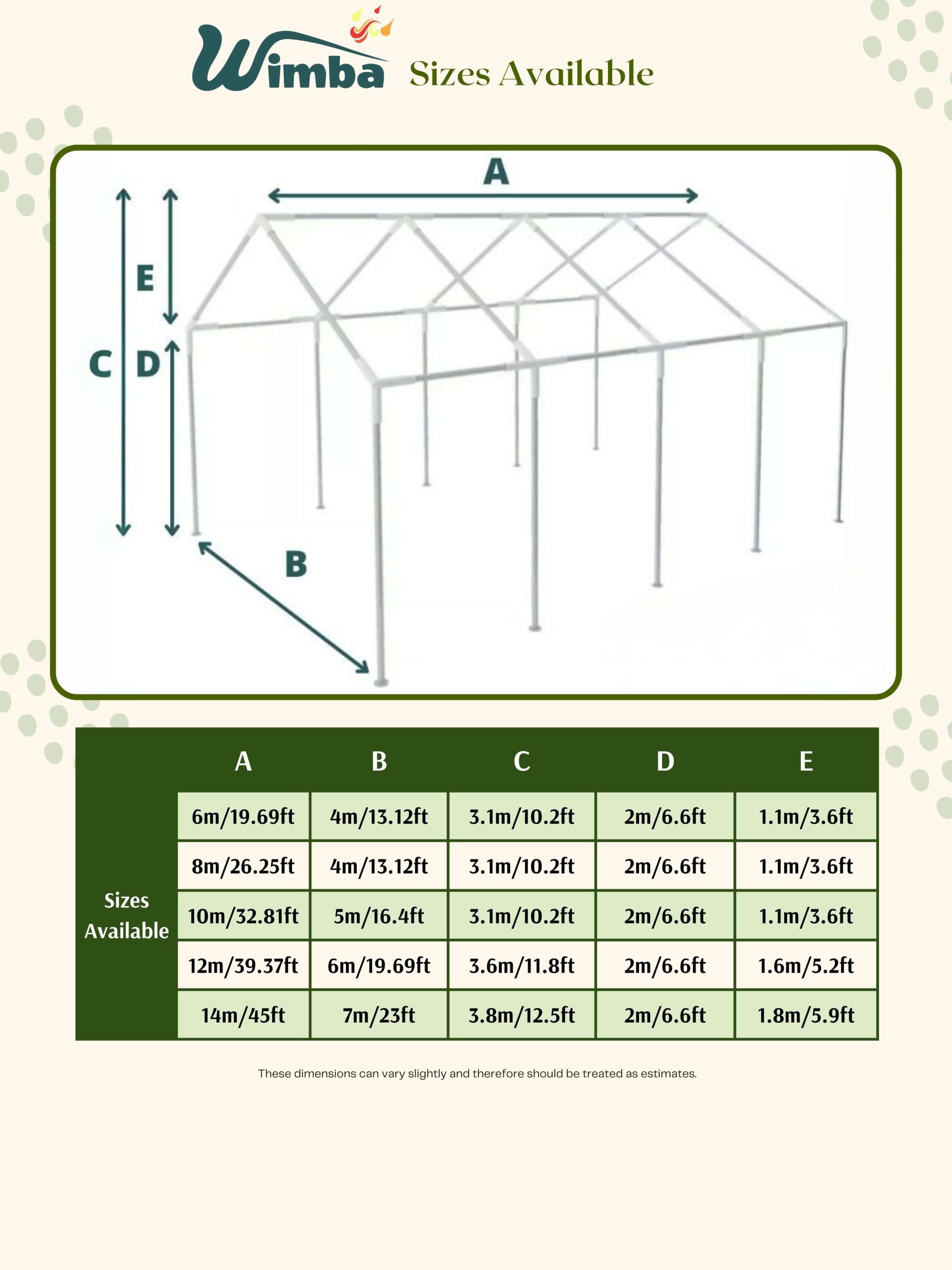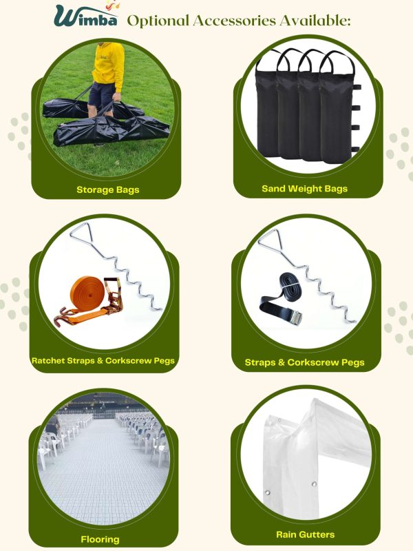 | Marquees are intended for events and other arrangements and are as such only meant for short term temporary assembly and disassembly. Wimba warranty applies only to the normal use of the product, normal wear and tear excepted, in accordance with written use instructions or manual. The warranty does not apply to damage caused by accident, abuse, weather conditions, misuse, modification or incorrect dismantle, erection, packing and storage of the product. |