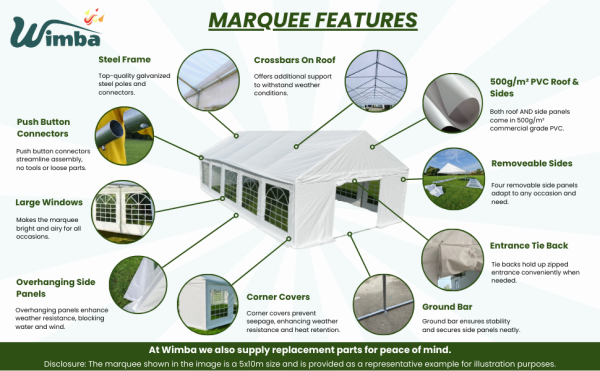 | Marquees are intended for events and other arrangements and are as such only meant for short term temporary assembly and disassembly. Wimba warranty applies only to the normal use of the product, normal wear and tear excepted, in accordance with written use instructions or manual. The warranty does not apply to damage caused by accident, abuse, weather conditions, misuse, modification or incorrect dismantle, erection, packing and storage of the product. | |